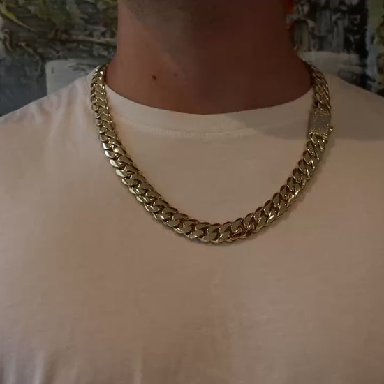 14MM Miami Cuban Link Chain – Premium 14k Gold Over .999 Silver + VVS1 Moissanite Stones Lock